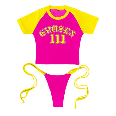 The Baby Tee Bikini is fully functional for swimming—made from premium swim fabric that is quick-drying and durable. However, its trendy design also makes it perfect for styling outside the water, so you can wear it as a top with your favorite denim or mesh skirt.